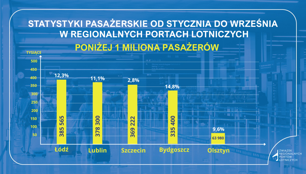 Roszady pojawiły się również wśród portów lotniczych obsługujących do miliona pasażerów rocznie. Liderem w grupie tych lotnisk zostało lotnisko w Łodzi i zajęło dotychczasowe miejsce Szczecina. Za Łodzią jest Lublin (różnica to około 7 tysięcy podróżnych), więc prawdopodobnie tu rozegra się najciekawsza „rywalizacja” pod koniec 2025 roku. Za Lublinem uplasowały się Szczecin, Bydgoszcz oraz Olsztyn-Mazury.